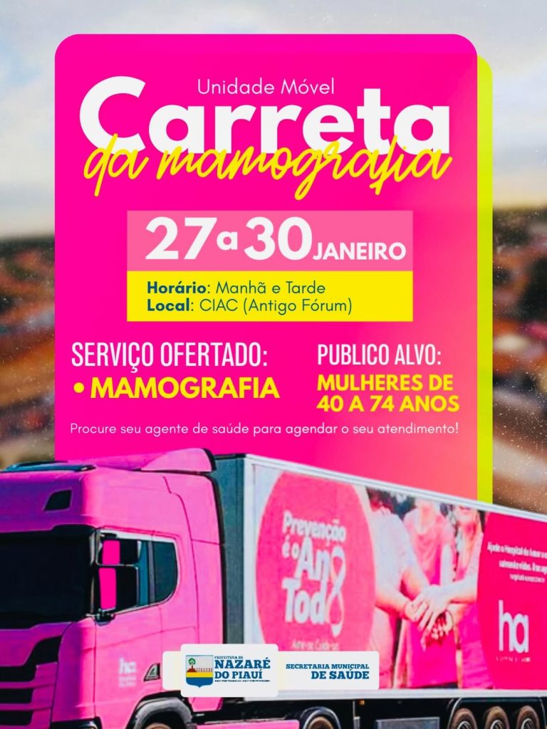O município de Nazaré do Piauí receberá, entre os dias 27 e 30 de janeiro, a Carreta do Amor, unidade móvel de saúde destinada à realização de exames de mamografia, reforçando as ações de prevenção e diagnóstico precoce do câncer de mama.
