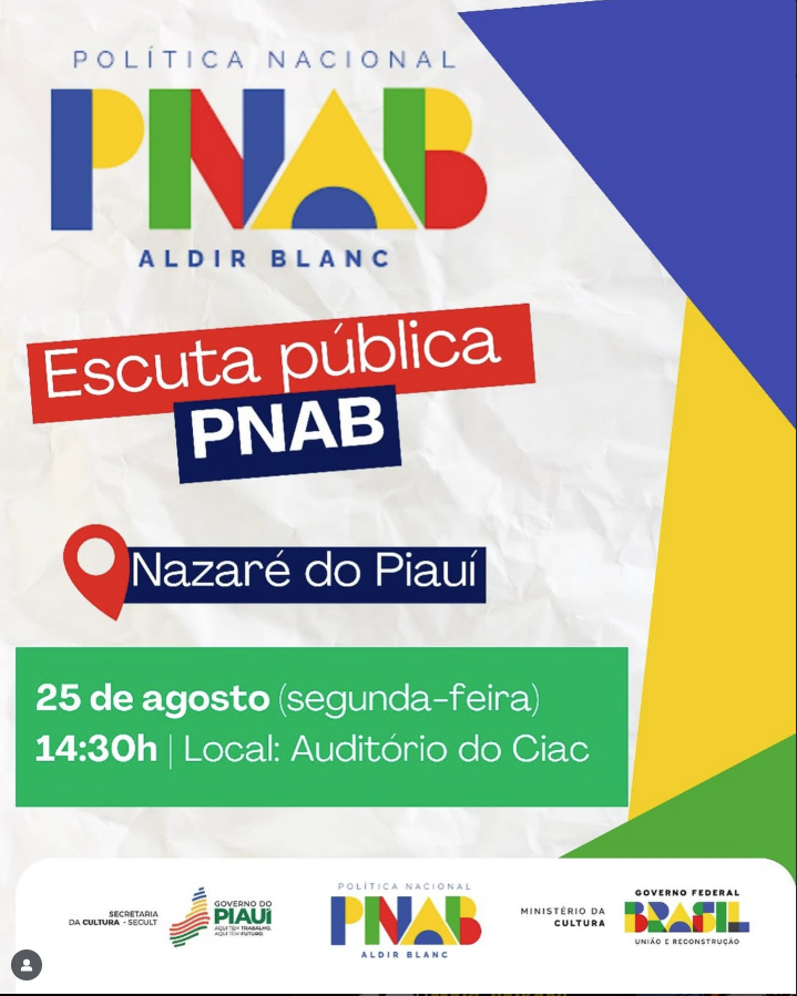 A Prefeitura de Nazaré do Piauí convida artistas, fazedores de cultura e a comunidade em geral para participarem da Escuta Pública da PNAB – Política Nacional Aldir Blanc, que será realizada no dia 25 de agosto (segunda-feira), às 14h30, no Auditório do Ciac.